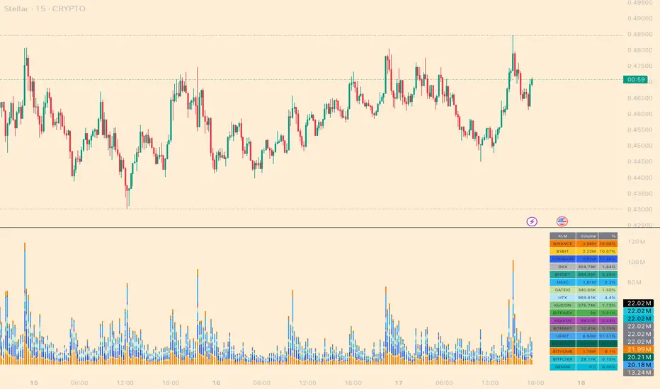 This indicator aggregates the real-time trading volume of a specific crypto asset across multiple exchanges and displays it as a single, stacked column chart. It allows you to grasp the total volume and its composition across the market at a glance.