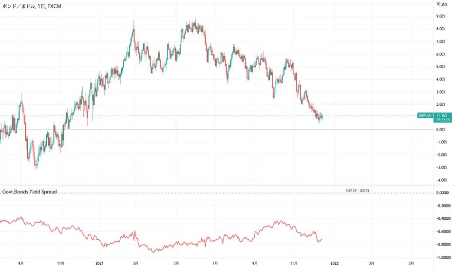 例えばGBPUSDのチャートを開くと、イギリス10年国債利回りとアメリカ10年国債利回りの差を計算して表示します。