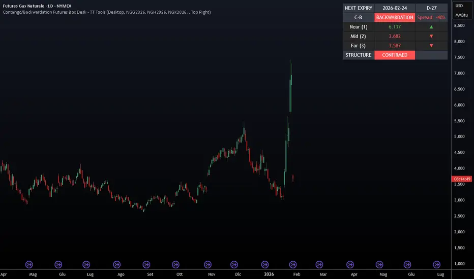 Questo indicatore mostra in modo chiaro, compatto e immediato la struttura Contango / Backwardation di una curva futures, direttamente sul grafico tramite un box informativo avanzato. È pensato per trader discrezionali, spread traders e analisi di curva, con una visualizzazione ottimizzata sia per desktop che per mobile.