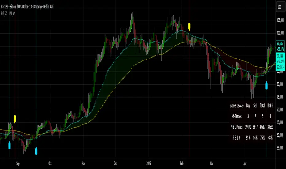 - A Table shows the effectiveness of the signals on the current visible chart, providing immediate, realistic feedback. The Buy & Hold strategy results are also included for comparison with the Buy/Sell swing strategy. The Buy & Hold results start from the first Buy signal to ensure a fair comparison.