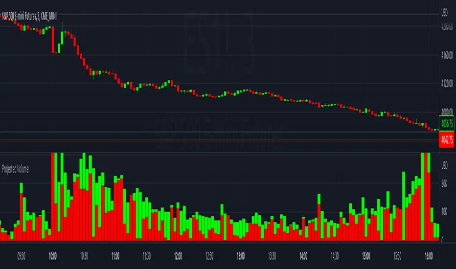 The indicator projects what each candle's final volume will be based on the amount of volume per second so far.