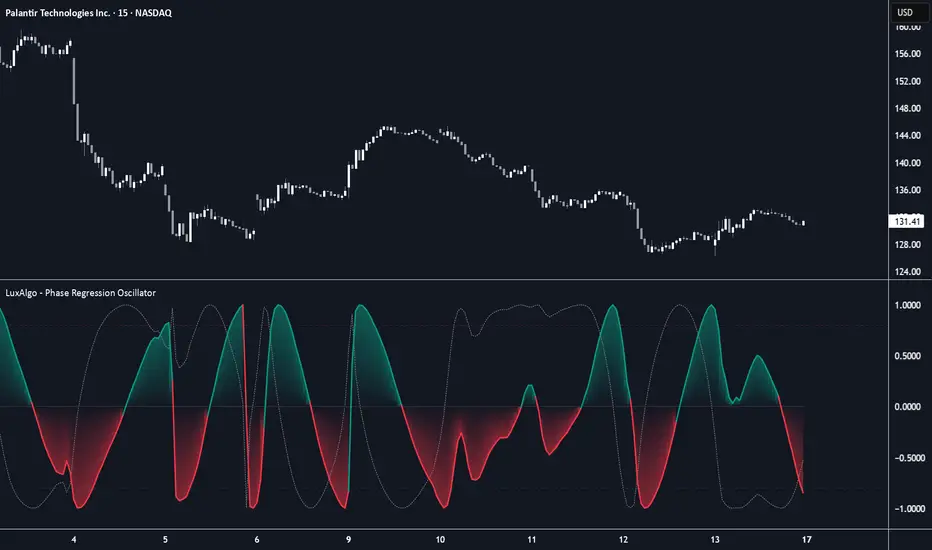 The Phase Regression Oscillator indicator is a cycle analysis tool that uses an analytical linear least squares fit to extract the instantaneous phase of a specified frequency relative to price action. By solving a system of normal equations on every bar, the script determines the "best fit" sine wave for a rolling window, providing a high-resolution view of the market's cyclical state.