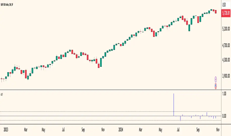 The Autocorrelogram (ACF) is a statistical tool designed for traders and analysts to evaluate the autocorrelation of price movements over time. Autocorrelation measures the correlation of a signal with a delayed version of itself, providing insights into the degree to which past price movements influence future price movements. This indicator is particularly useful for identifying trends and patterns in time series data, helping traders make informed decisions based on historical price behavior.