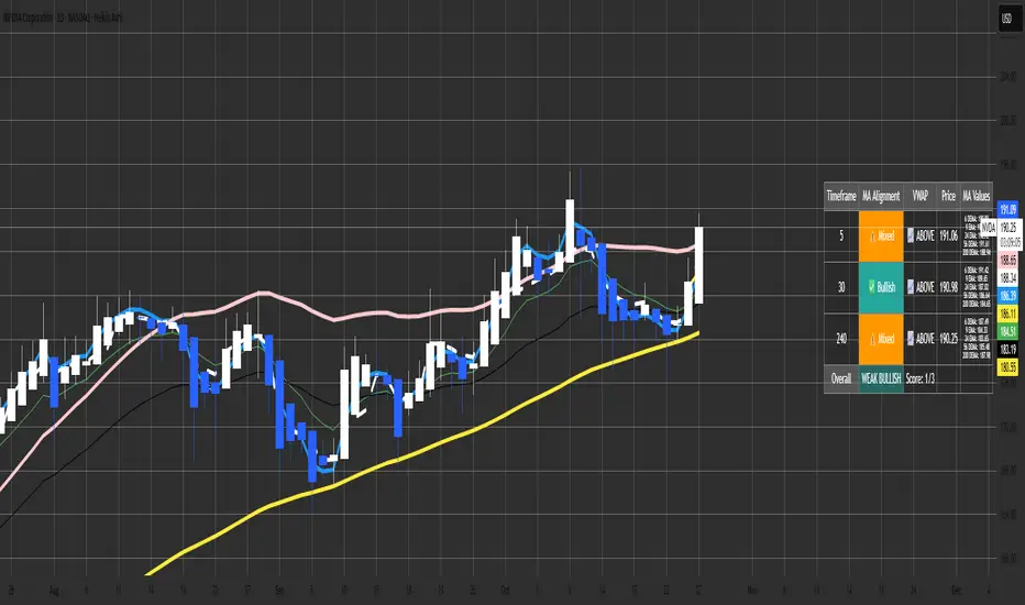 Malama's Multi-Timeframe Moving Average Alignment Scanner (MTF MA Scanner) is an overlay indicator designed to simplify trend analysis by evaluating the alignment of multiple moving averages (MAs) across user-defined timeframes. It scans for bullish (MAs stacked ascending), bearish (descending), or mixed/neutral configurations, incorporating a VWAP (Volume Weighted Average Price) filter to contextualize price position relative to volume-based equilibrium. The result is a compact dashboard table summarizing signals from up to three timeframes, helping traders spot confluence for entries or reversals without manually switching charts. This tool draws from classic MA ribbon concepts but adds flexible MA types, dynamic sorting, and an overall trend score for quicker multi-TF insights.