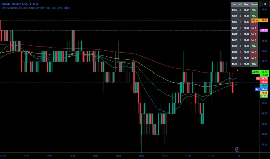 The table shows up to 10 most recent crossovers, automatically updating as new signals appear. If no crossovers have occurred during the session within the time filter, it displays "Henüz kesişim yok" (No crossovers yet).EMA Color Coding: