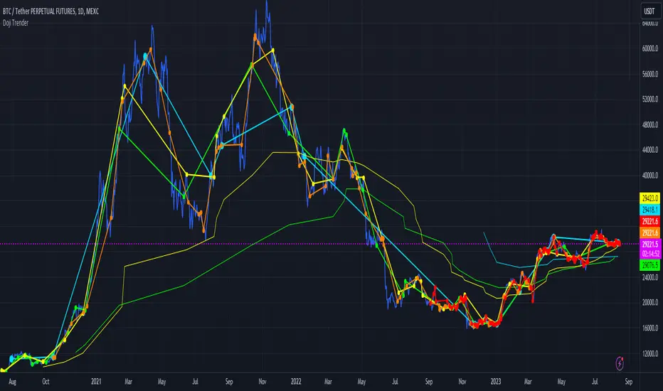 Doji Trender searches multiple timeframes for candles where open and close are less than dojiPercent apart (default 0.025%), and plots the trends between them.