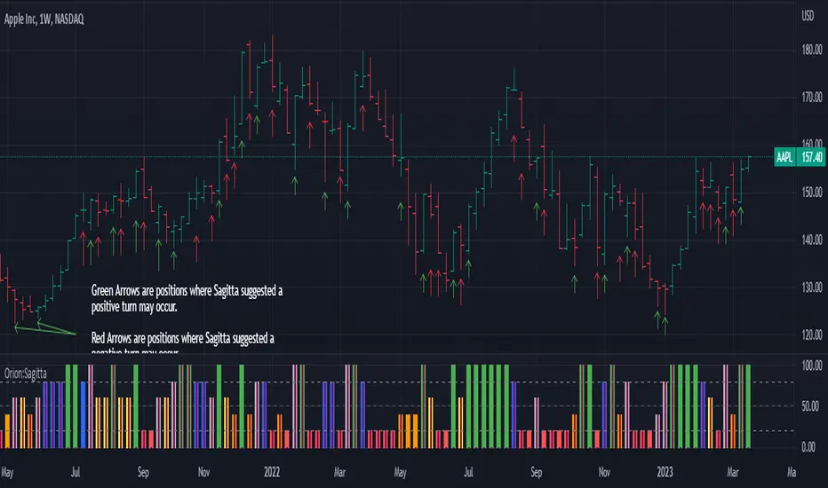 Behind the scenes, Sagitta is nothing more than a 2 period stochastic which has had its values divided into five specific zones.