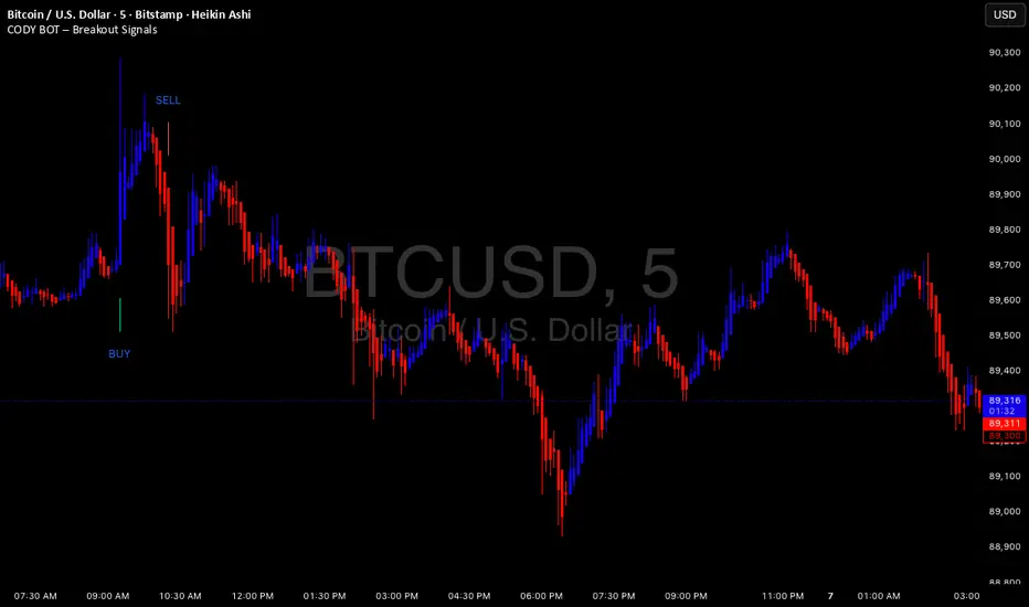 CODY BOT is a minimalist, high-probability breakout indicator designed to keep your chart clean while highlighting actionable trading opportunities.