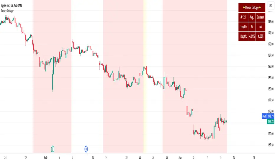 The number of Power Outages that have occurred, their average length, and average depth (from the first day's close when the Power Outage activates to the low of the Power Outage) are all displayed to help assess the condition of the current Power Outage.