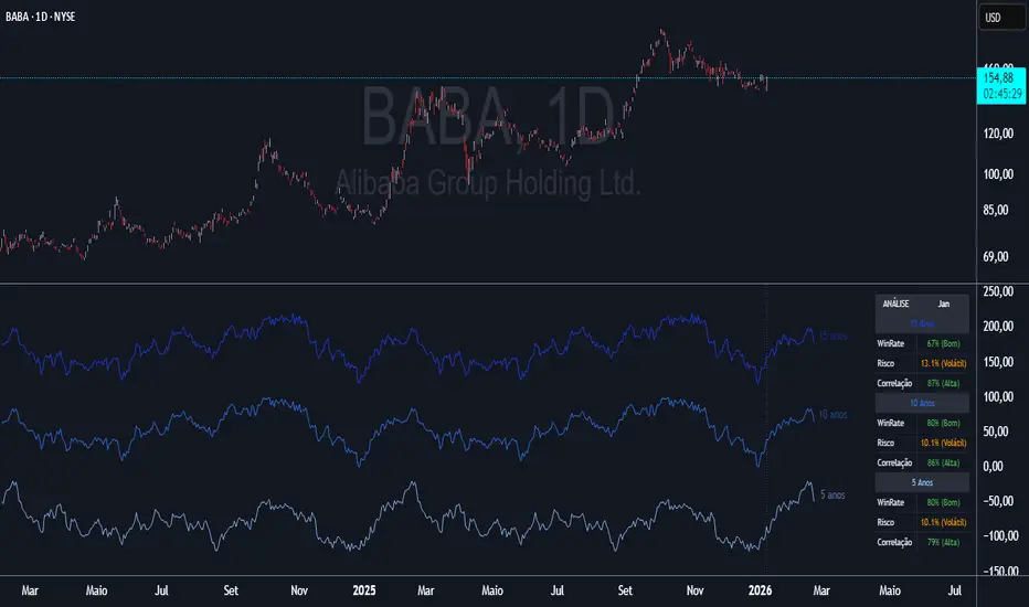 Descrição Este indicador é uma ferramenta completa de Sazonalidade que projeta tendências futuras baseadas em padrões históricos. Ele inclui um painel estatístico exclusivo que mostra a probabilidade (WinRate) e a correlação do ciclo atual.