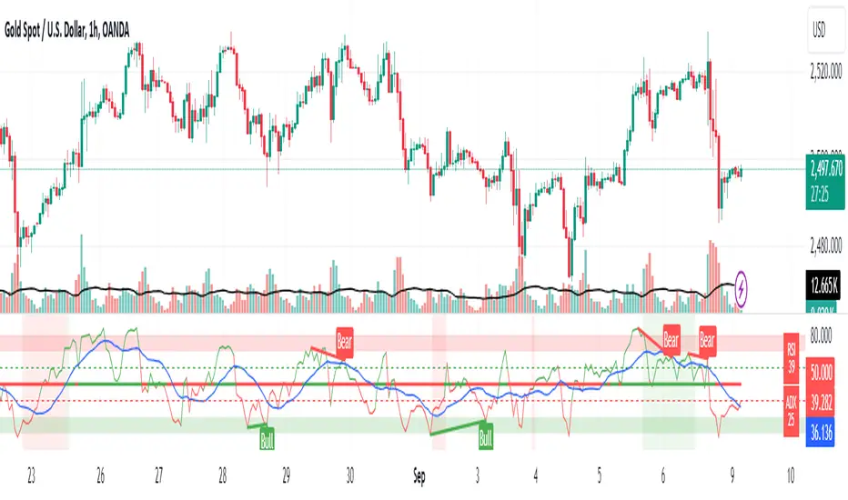 This Pine Script is designed to provide a comprehensive view of market conditions by combining the Relative Strength Index (RSI) and the Average Directional Index (ADX) indicators. The script offers a range of customizable features to help traders analyze trends, identify overbought and oversold conditions, and make informed trading decisions.