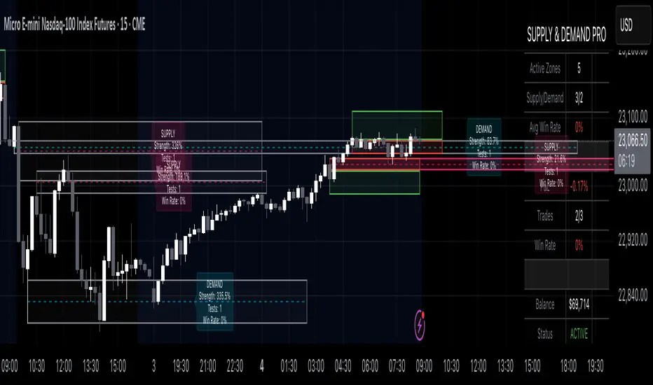 The most comprehensive Supply & Demand indicator on TradingView, designed for serious traders and prop firm professionals. Unlike traditional S&D indicators that just draw pretty zones, this system tracks actual performance metrics, provides entry/exit signals, and includes professional risk management tools.