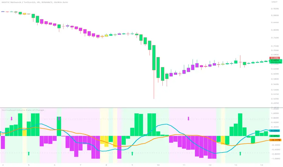 This indicator is designed to help traders gauge changes in volume dynamics and identify potential shifts in buying or selling pressure. By normalizing the volume rate of change and comparing it to moving averages of itself, it offers valuable insights into market trends and can assist in making informed trading decisions.