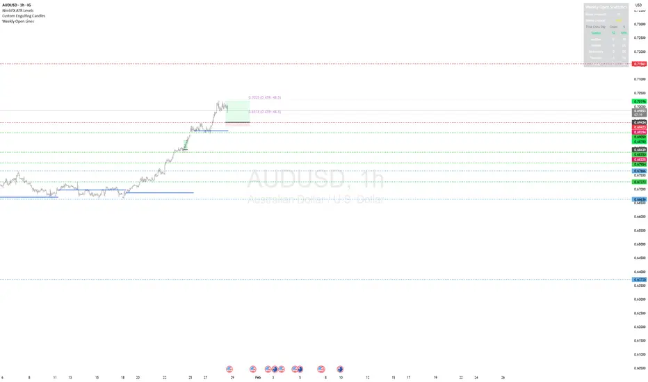 Weekly open price plotted on the 1h chart, fwd looking across the week. Stats showing likelihood of a return to the open price by weekday.