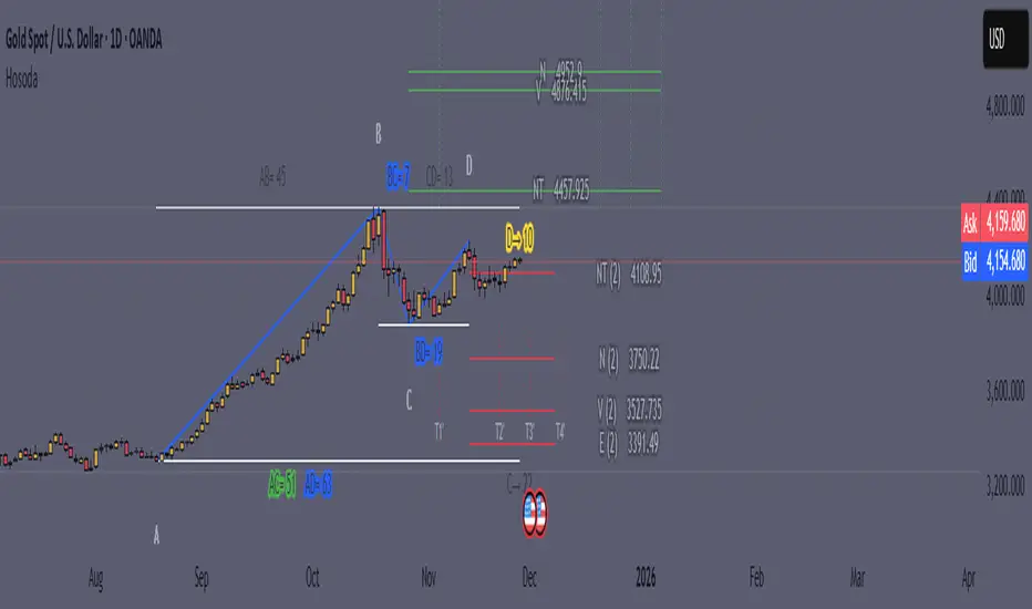 The indicator contains classic price levels N, V, E and NT, and is supplemented with intermediate levels V+E, V+N, N+NT and x2, x3, x4 for levels V and E, which are used in cases where the wave does not contain corrections and there is no possibility to update the impulse-corrective wave.
