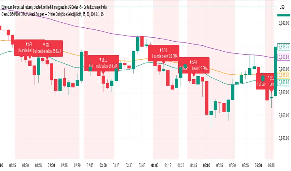 We have to take the trade when all three EMAs are pointing in the same direction (no criss-cross, no up/down, sideways). All 3 EMAs should be cleanly separated from each other with strong spacing between them; they are not tangled, sideways, or messy. This is our first filter before entering the trade. Are the EMAs stacked neatly, and is the price outside of the 25 EMA? If price pulls back and closes near or below the 25 or 50 EMA and breaks the 100 EMA, we don't trade. Use the 100 EMA as a safety net and refrain from trading if the price touches or falls below the 100 EMA.