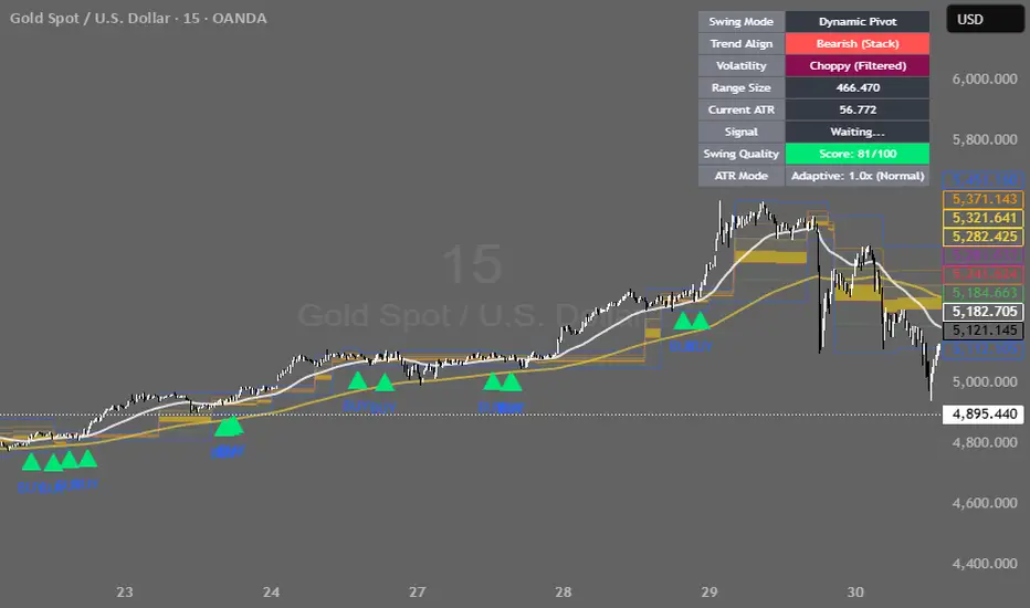 • An on chart dashboard that summarizes swing mode, trend status, swing quality score, current ATR mode (Fixed vs. Adaptive), and signal status.