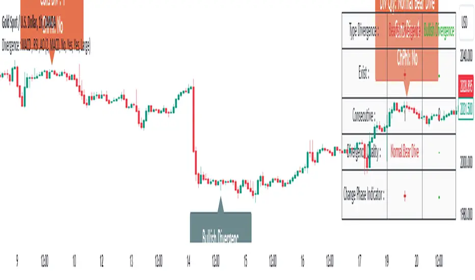 🟣Label: Unlike the table, which only shows information about the latest divergence, labels display information about each divergence at the point where it occurs. The information includes the type of divergence, detection method, divergence quality, consecutive divergences, and change in phase indicator. The selected method of detection is also displayed. For example, if the chosen method is the "AO" indicator, the label will show "Method: AO."