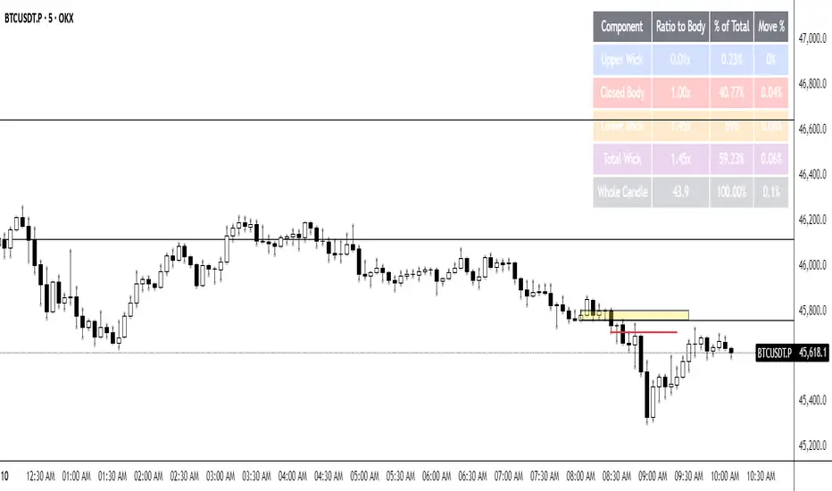 The "Wick to Body Ratio Table" is a comprehensive analytical tool designed to provide traders with detailed insights into candle structure and price movement dynamics. This indicator breaks down each candle into its component parts and displays real-time statistics in an easy-to-read table format.