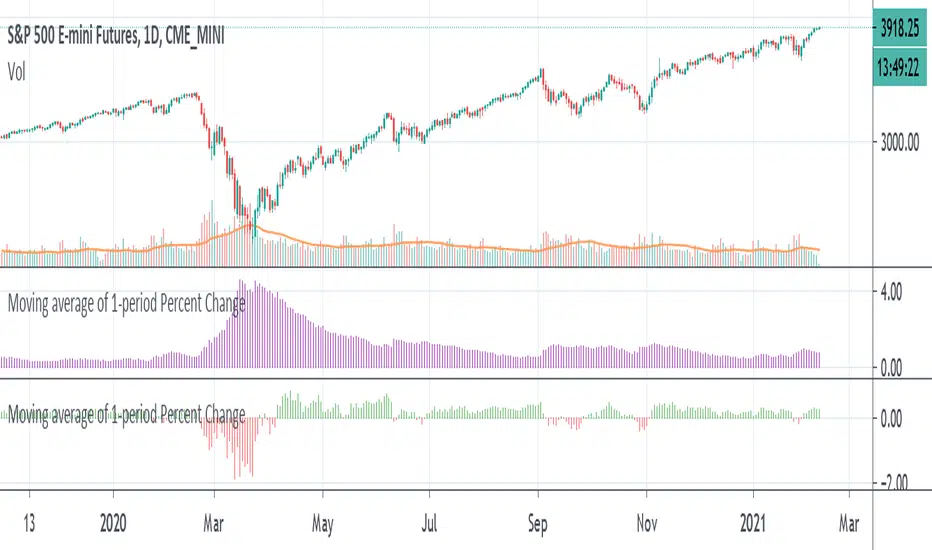 Another way of finding the average range of the bars using 1 period percentage change of the price and taking an average of them. It's given in percentages and the absolute value of the average can be shown when the option is turned on, or the average including the up and down bars can be shown. Perhaps an alternative way of looking at volatility or range of the bars. If you prefer a line version over histogram, just simply change the style under the settings of the indicator.