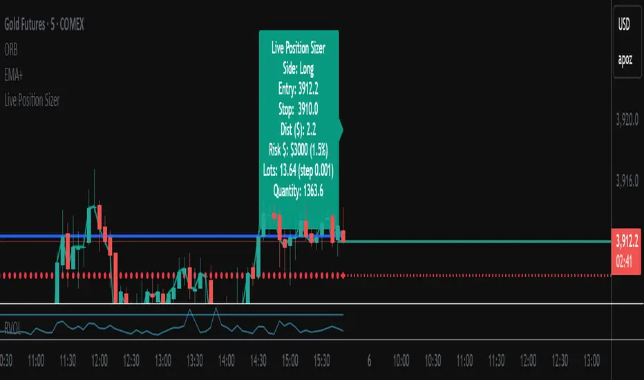 This position calculator locks onto the live price in real time and calculates your lot and quantity size for you. Best for scalping if you don't want to open a limit order. You input all the necessary data (Account size, risk, SL placement, LONG/SHORT position, etc...) It also has a nifty feature of allowing you the ability to see TP brackets (+1R, +2R, +3R).
