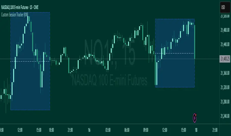 Custom Session Tracker (KN) lets you define any trading session (e.g. 09:30–16:00 NY time) and automatically draws: