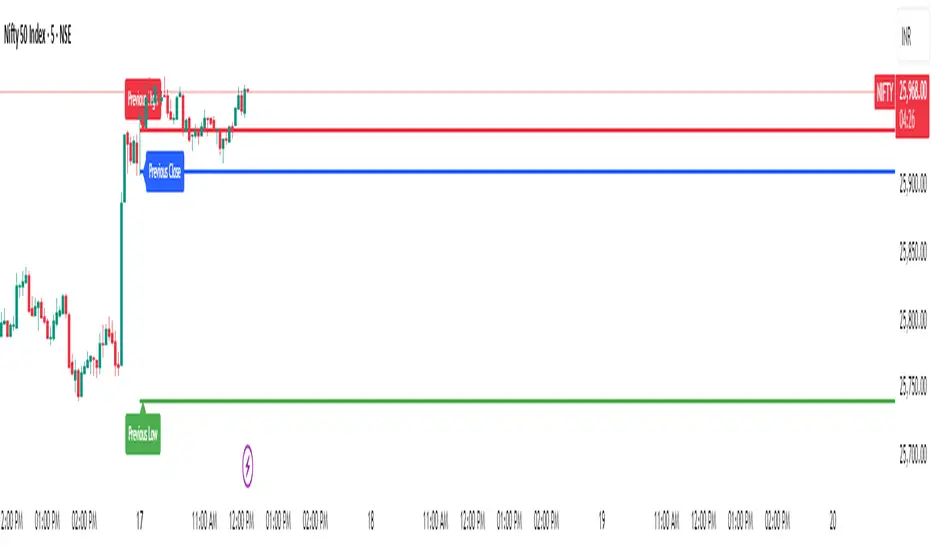 This indicator provides intraday traders and analysts with immediate visual reference to the previous day's high, low, and close. These historical price levels are frequently watched by market participants for potential reaction, context, and session structure.