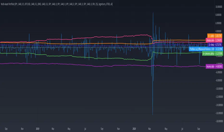 With thanks to luminaryfi for tradingview.com/script/0T7X2HEB-Portfolio-Metrics-α-Jensen-s-β-CAPM-Ra-Sharpe-Treynor/, this indicator calculates basic metrics and statistics for a multi-asset portfolio. Note that returns are plotted after being multiplied by 100 in order allow the series to be visible against the other statistics.