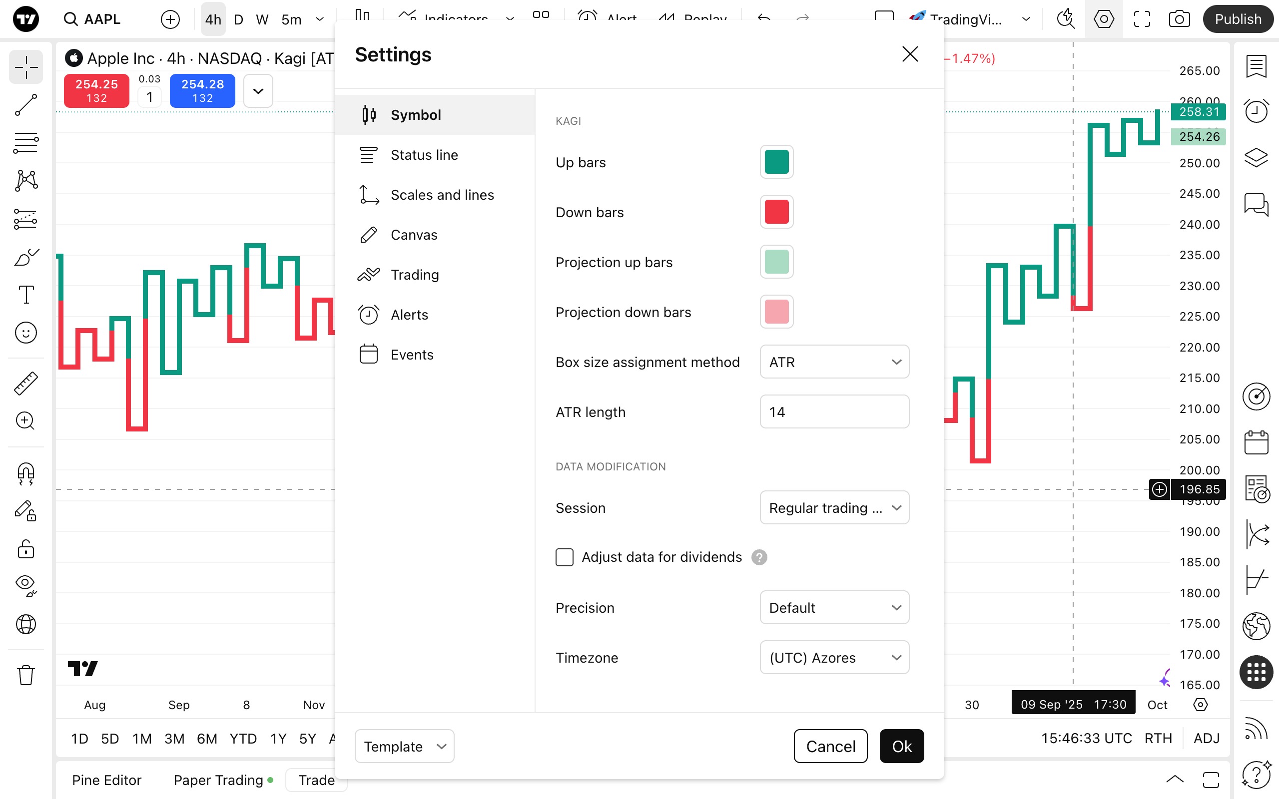 Wykresy Kagi to specyficzny typ wykresu składający się z pionowych linii — zielonych dla ruchów wzrostowych i czerwonych dla spadkowych — oraz małych linii poziomych, które je łączą. Podobnie jak wykresy Renko, wykresy Kagi nie uwzględniają czasu. Interwały czasowe są całkowicie pominięte, ponieważ wykresy Kagi biorą pod uwagę wyłącznie ruch ceny. Wszystkie te typy wykresów opartych na czasie są dostępne na Superwykresach.
