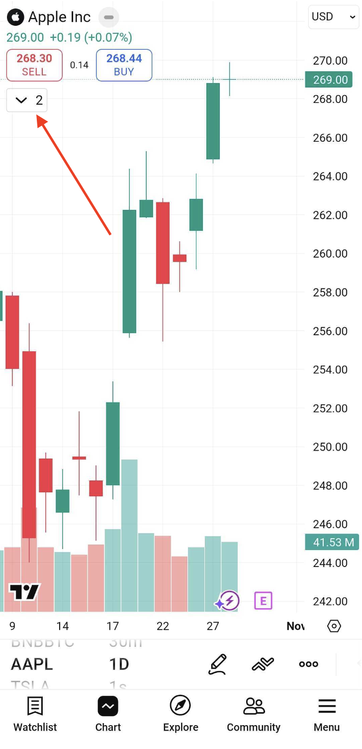 Żeby usunąć wskaźnik lub otworzyć jego ustawienia, musisz otworzyć legendę wykresu, klikając ikonę plus obok nazwy symbolu: